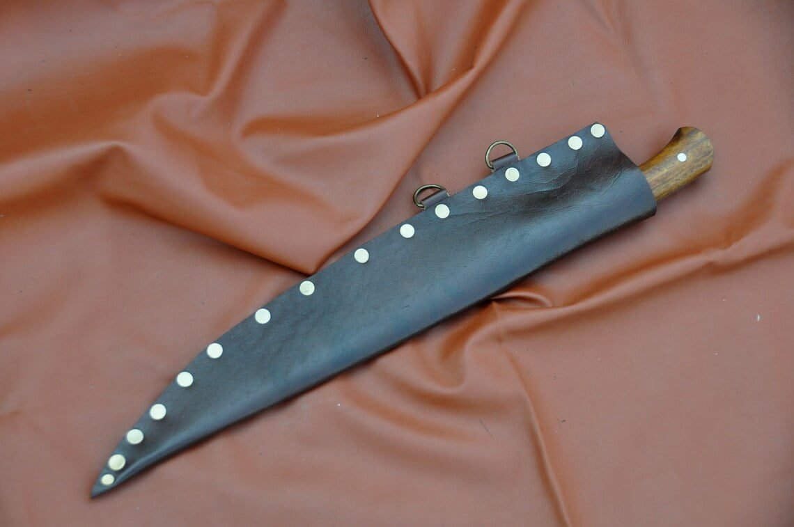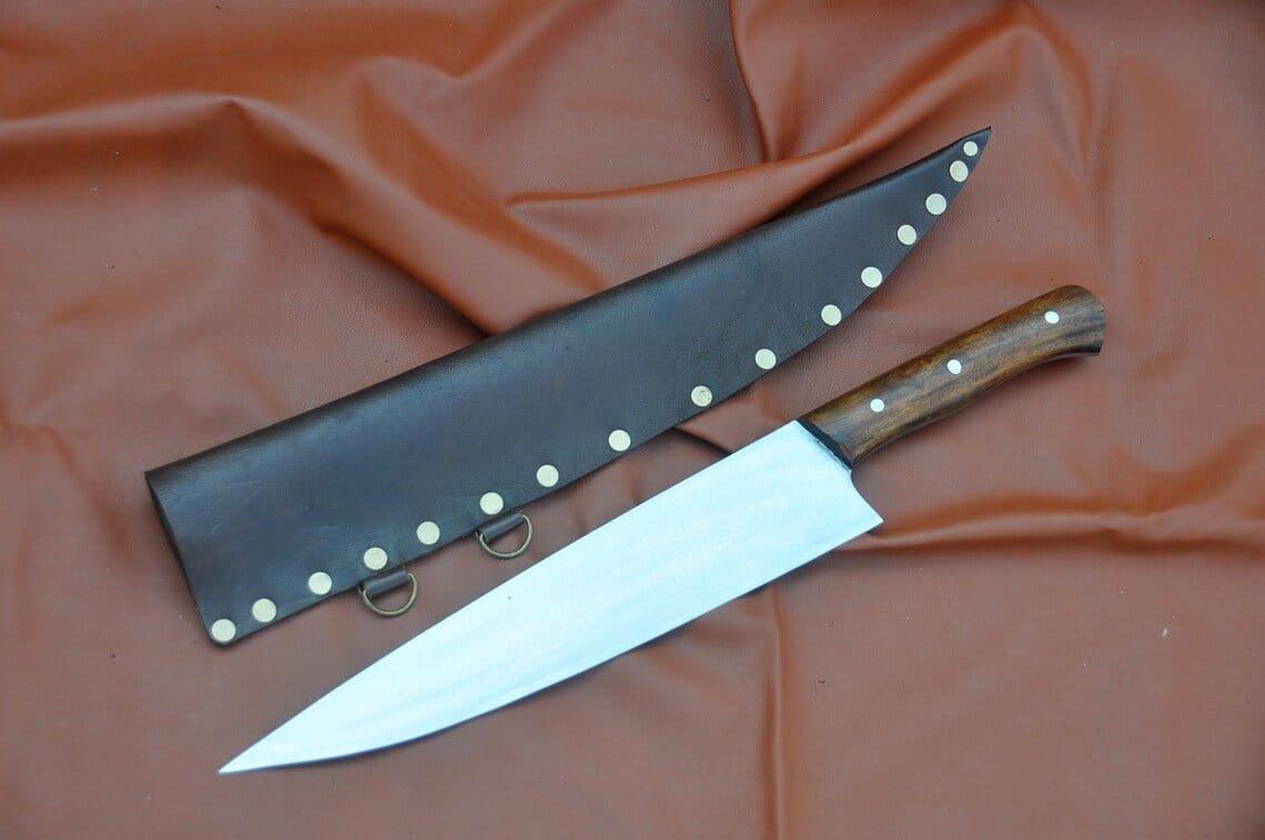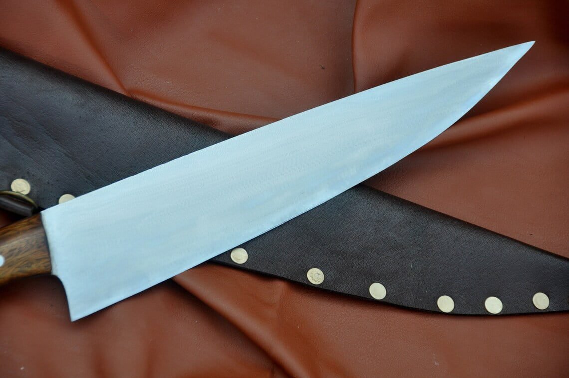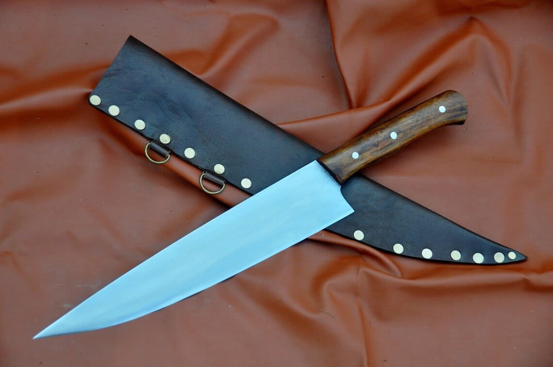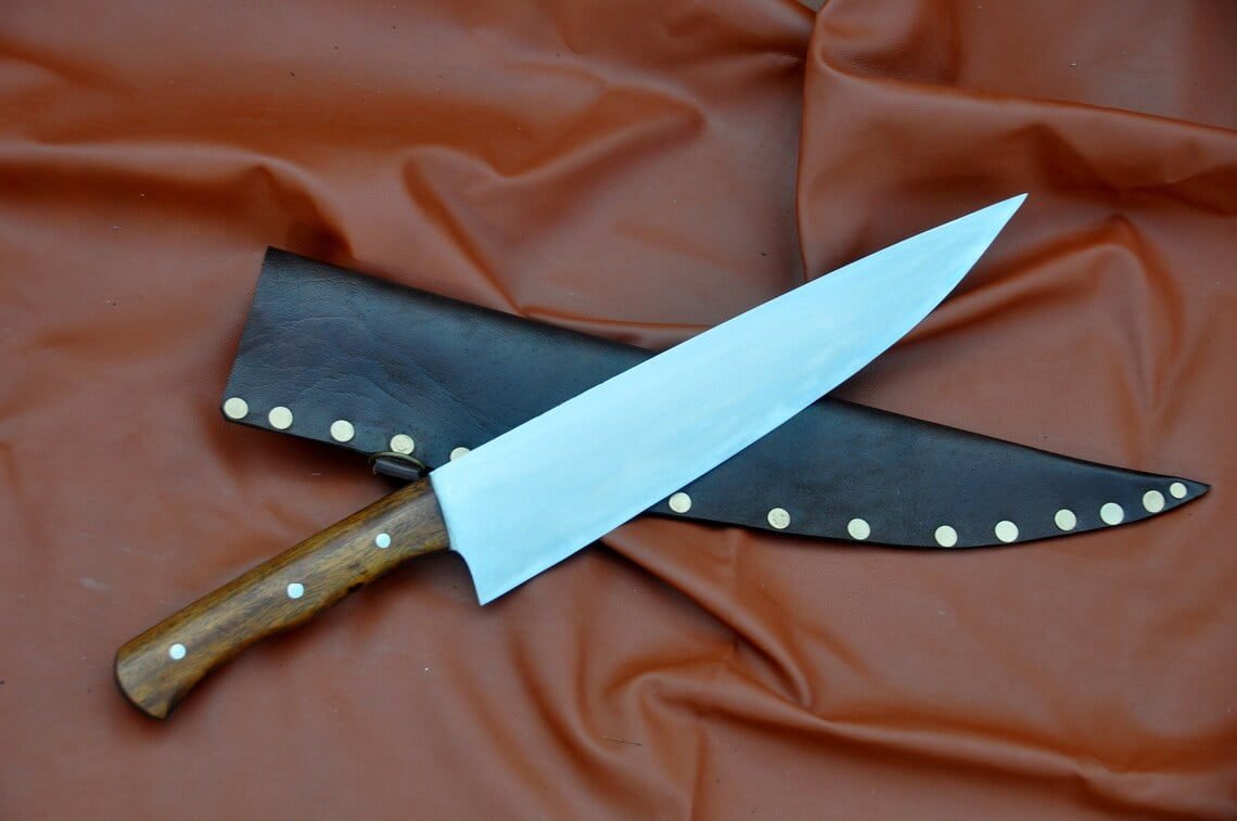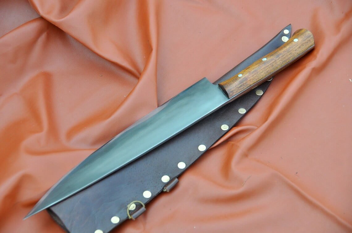 The 13.5 inches full tang chef knife stands apart as one of the best kitchen knife custom models. From the balance to the edge retention, it performs in all culinary settings. The high carbon steel ensures durability while the walnut wood adds traditional elegance to your kitchen.
