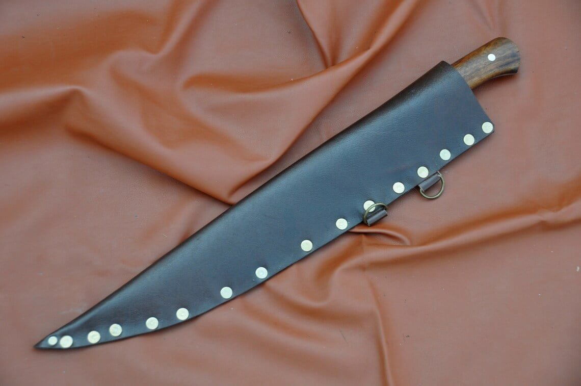 This handmade kitchen knife comes with a custom cowhide leather sheath, designed to protect the blade when not in use. The sheath ensures safe storage and helps preserve the blade’s sharp edge by shielding it from moisture and impact. The riveted leather design is both functional and elegant, complementing the craftsmanship of the knife.